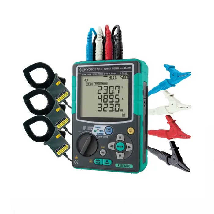 The Kyoritsu KEW 6305-01 power meter is a digital device that measures various electrical parameters such as voltage, current, power, and energy consumption. It is designed for use in single- and three-phase systems and can display measured values in a variety of units including kilowatts, volts, and amps.